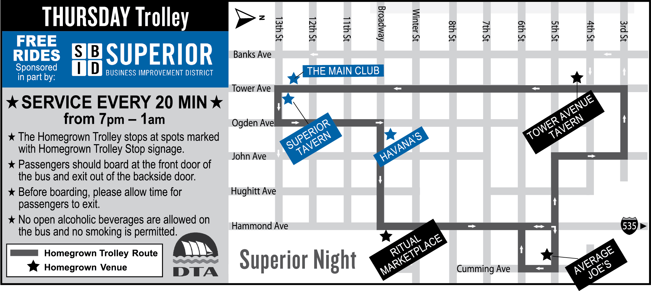 The SBID is once again sponsoring the DTA Homegrown Trolley. The trolley offers safe, free rides to all of the Superior Homegrown venues and picks up at regular DTA stops along the route. Service will run every 20 minutes from 7 pm until 1 am. Venues marked in blue are SBID stakeholder businesses. Click on the map graphic to view the in more detail.